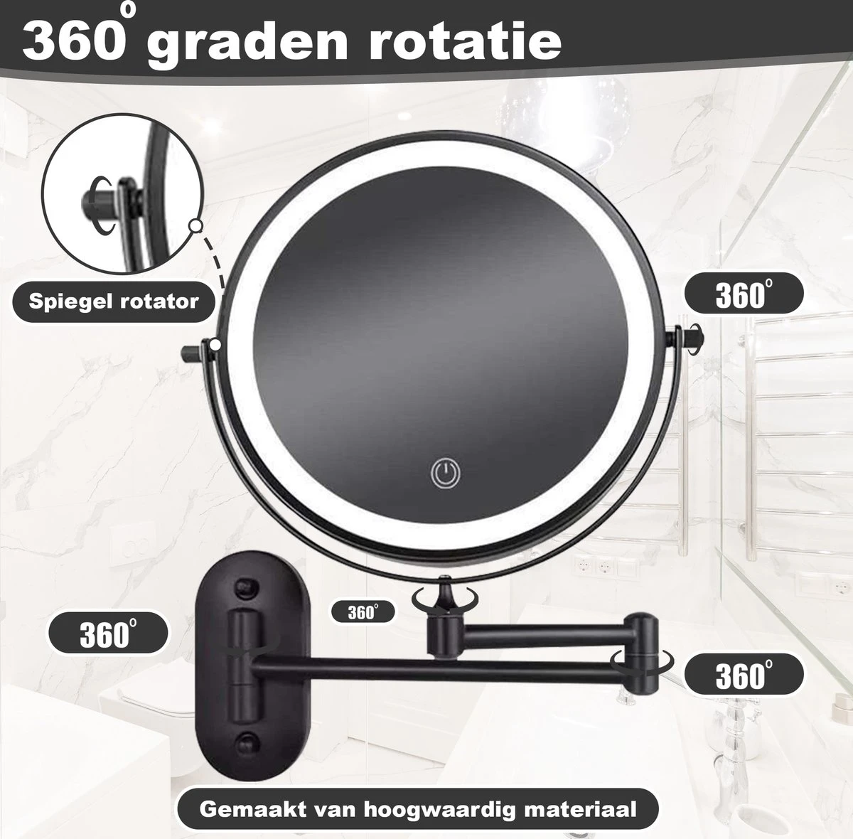Make Up – Spiegel – Led Verlichting – 10X Vergroting – 3 Lichtstanden – Wandspiegel Rond – Badkamer – Mat Zwart – Draadloos