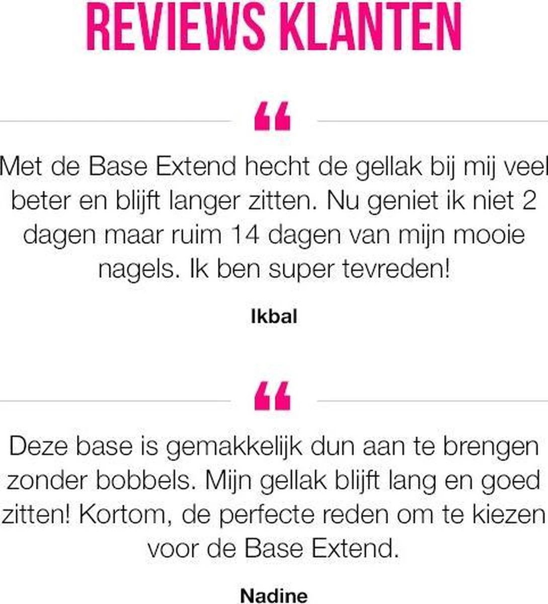 Blijft jouw gellak niet mooi zitten? Met de Base Extend van Pink Gellac los je dit op. Deze fijne base coat zorgt namelijk voor een goede hechting en sterkere nagels, zonder dat je daarvoor een Primer nodig hebt. De Base Extend is de snellere afweekbare base, zodat je de gellak makkelijk en snel kunt verwijderen zonder je nagels te beschadigen. Hard een dun laagje Base Extend eerst 60 seconden uit onder de LED lamp of 120 seconden onder de UV lamp, voordat je gellak aanbrengt.